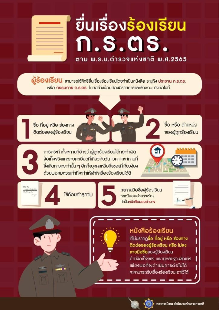 กองสารนิเทศ ในฐานะคณะทำงานย่อยด้านสื่อสารองค์กร ได้จัดทำอินโฟกราฟิก เรื่อง การเสนอเรื่องร้องเรียน ก.ร.ตร. ตาม พ.ร.บ.ตำรวจแห่งชาติ พ.ศ.2565 จึงขอความร่วมมือในการเผยแพร่ให้ข้าราชการตำรวจในหน่วยของท่านทุกระดับจนถึงสถานีตำรวจ/กก. ได้ทราบ
