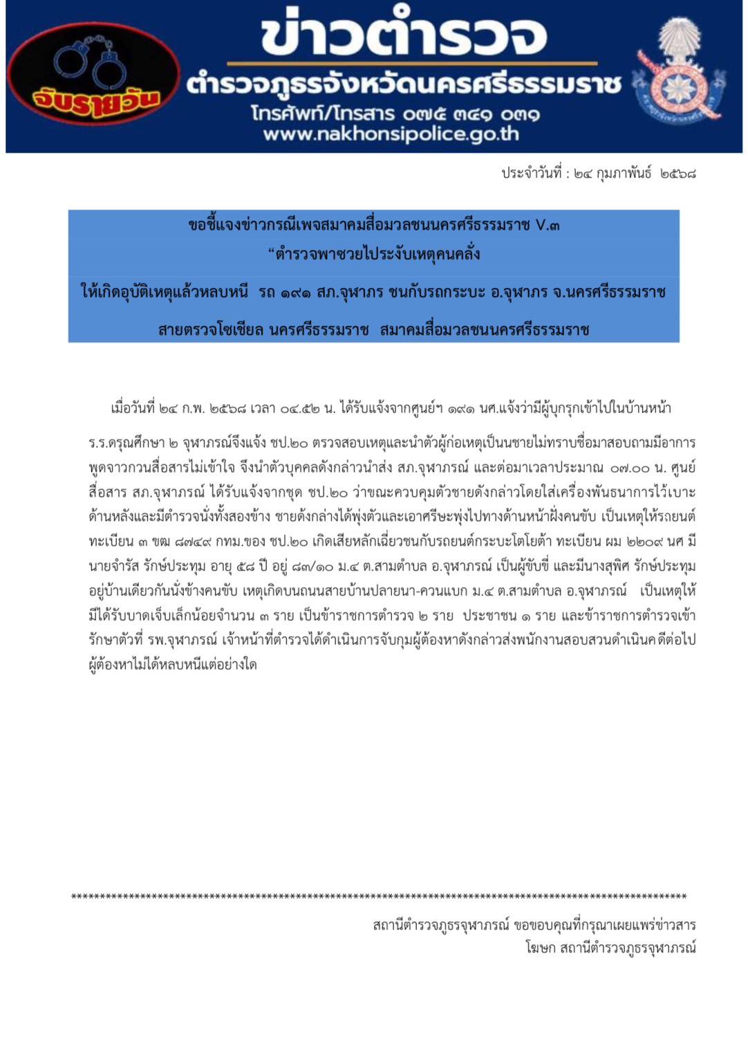 24 ก.พ.เวลา 22.30 น.———————————————ภายใต้การอำนวยการของ👮‍♂️พ.ต.อ.ธวัชชัย สังฆมิตกล ผกก.สภ.จุฬาภรณ์👮‍♂️พ.ต.ท.เรวัตร แก้วจำรัส รอง ผกก.ป.สภ.จุฬาภรณ์ 👮‍♂️พ.ต.ท.ณรงค์ ทองนุ่น สวป.สภ.จุฬาภรณ์———————————————🚨มอบหมายให้🚨ร.ต.ต.อนันต์ สุวรรณชาตรี รอง สว.(ป) สภ.จุฬาภรณ์ (จุฬาภรณ์ 2-0) พร้อมกำลัง ว.4 ให้ความช่วยเหลือประชาชน รถยนต์เก๋งยางรั่วบริเวณริมถนนสายเอเชีย41 ฝั่งขาล่อง ม.1 ต.ทุ่งโพธิ์ อ.จุฬาภรณ์ จ.นครศรีธรรมราช เบื้องต้นได้ให้ความช่วยถอดล้อไปเปลี่ยนยางที่ร้านซ่อมจนสามารถเดินทางต่อไปได้เป็นที่เรียบร้อย
